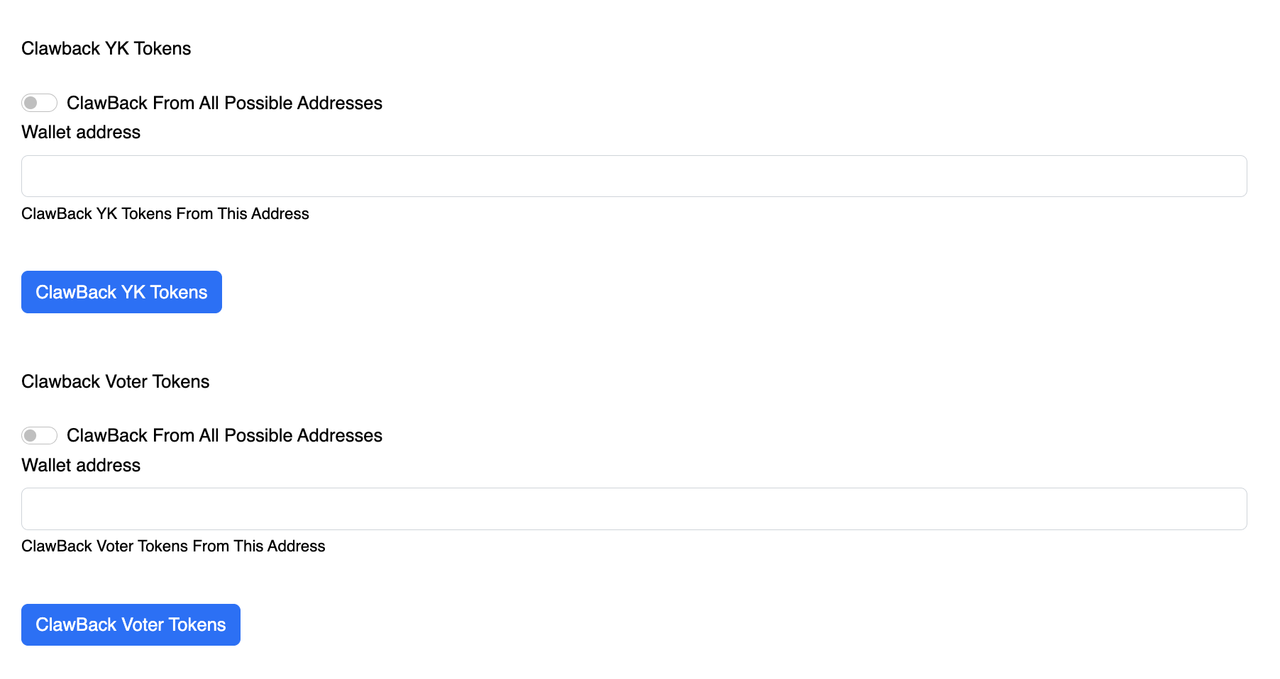 In this screen, admins can clawback the 'Voter' or 'YK' tokens with the specified address. By ticking the boxes, clawback from all the addresses in the DAO is possible too!
