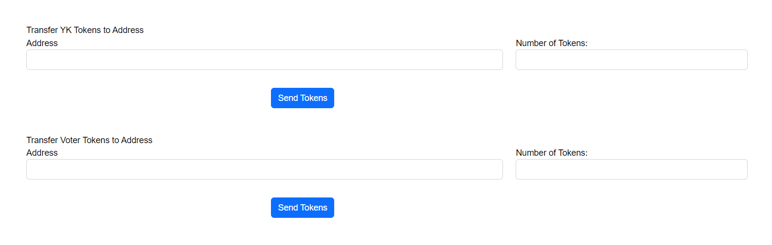Admins can transfer YK and voter tokens to the specified addresses from this screen. Just pass the address and amount of tokens into the form, confirm through Metamask and its all set!