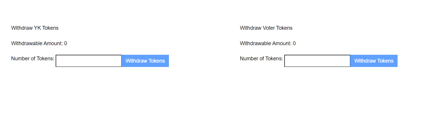 Admins can withdraw YK and voter tokens from their addresses through this screen. Just pass the amount of tokens into the form, confirm through Metamask and its all set!